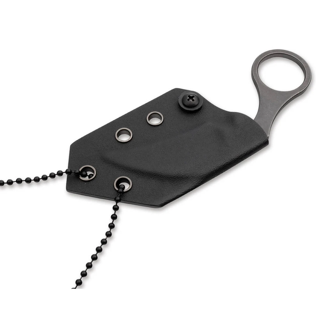 Includes a kydex sheath and a ball chain for use as a neck knife.Â
