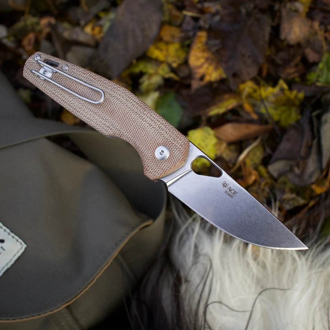The GiantMouse ACE Nimbus Natural Canvas Micarta Folding knife is a slender knife that packs a punch. This slim folding knife boasts a beautiful, sleek Natural Canvas handle and Elmax steel. With an ergonomic design made to fit perfectly in your hand, this powerful knife is a great EDC.Â