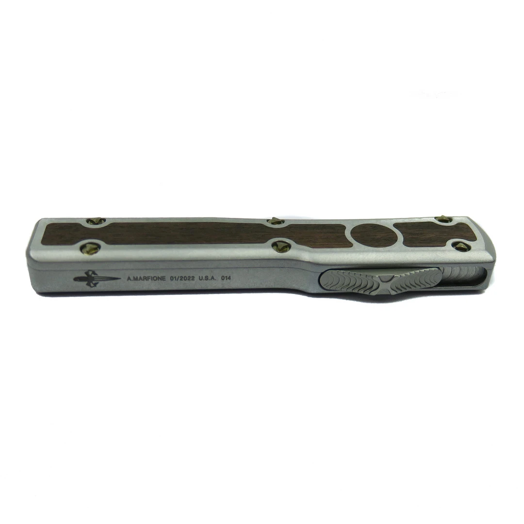This Marfione Custom Knives UTX70 features a two-tone 416 stainless steel chassis with ironwood inlays. It also features bronze 6AL-4V titanium hardware. The Marfione Dagger Logo is engraved on the side of the body along with A. Marfione, a 01/2021 birthdate, U.S.A, and the serial number.