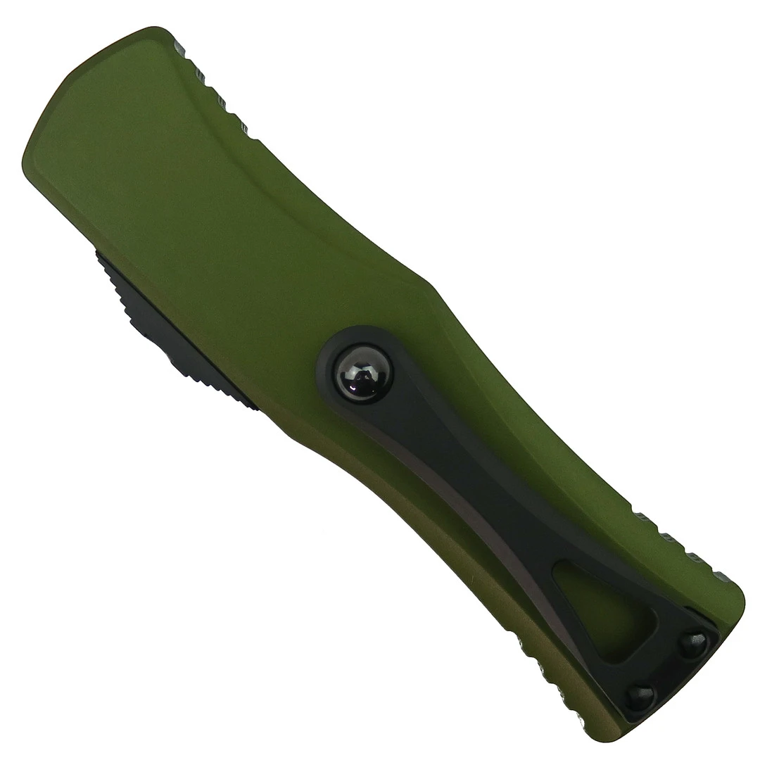 The Microtech OD Green Hera OTF is a tactical knife with a beautiful, ergonomic design. This knife features a dagger blade which is fully serrated on one side and plain on the other, providing you with a variety of cutting abilities. The blade is paired up with an OD Green anodized aluminum handle.Â