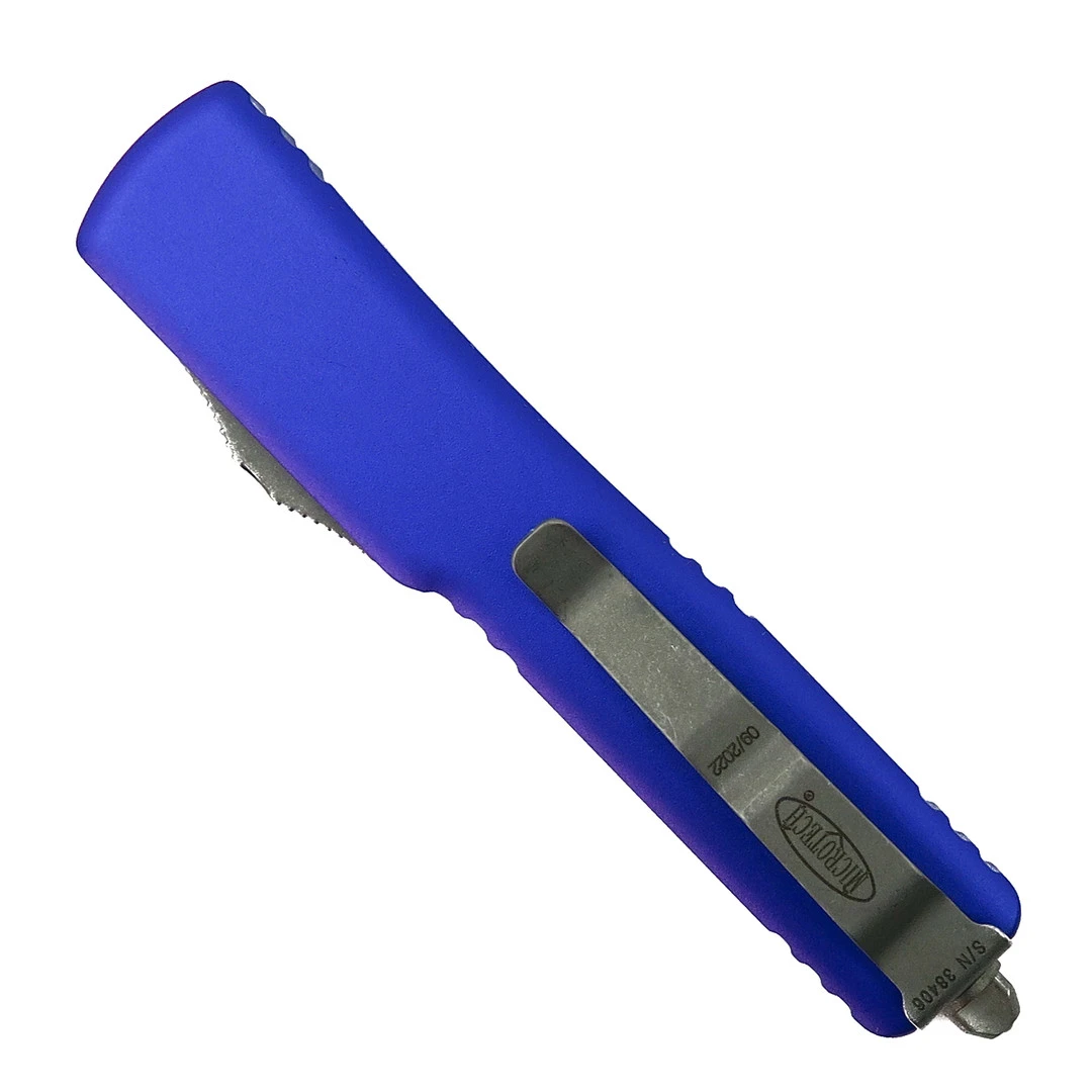 This Microtech UTX-70 OTF knife features a purple anodized aircraft-grade aluminum handle and an apoclyptic stonewash finished dagger blade.