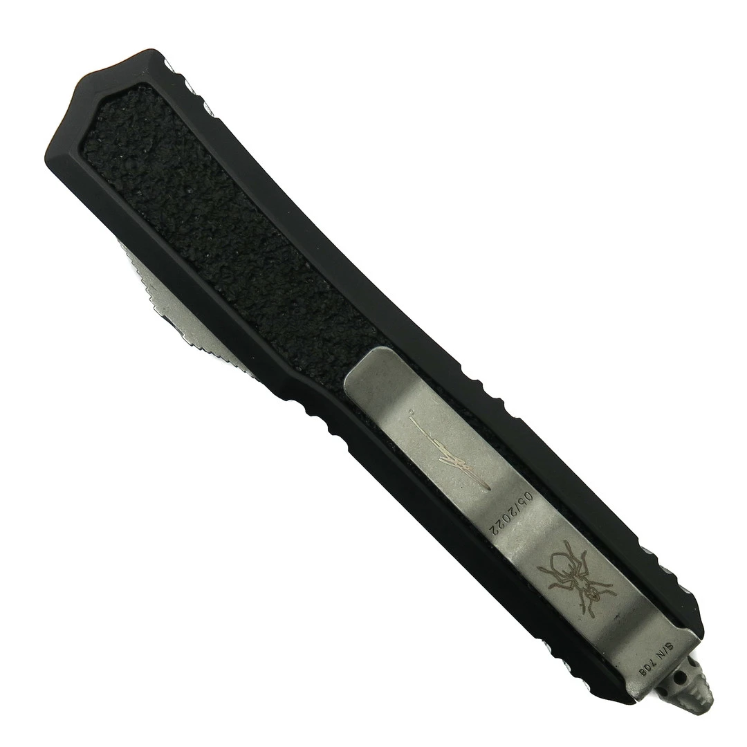 This Microtech Makora OTF automatic features an apocalyptic stonewash finished dagger blade.