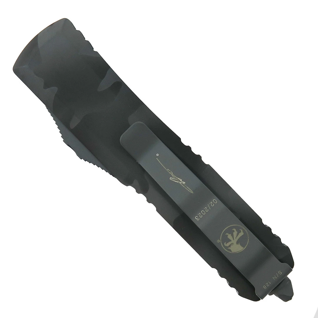This Microtech Signature Series UTX-85 boasts an urban camo Mil-Spec hard anodized finished handle. The dagger blade has a matching finish.