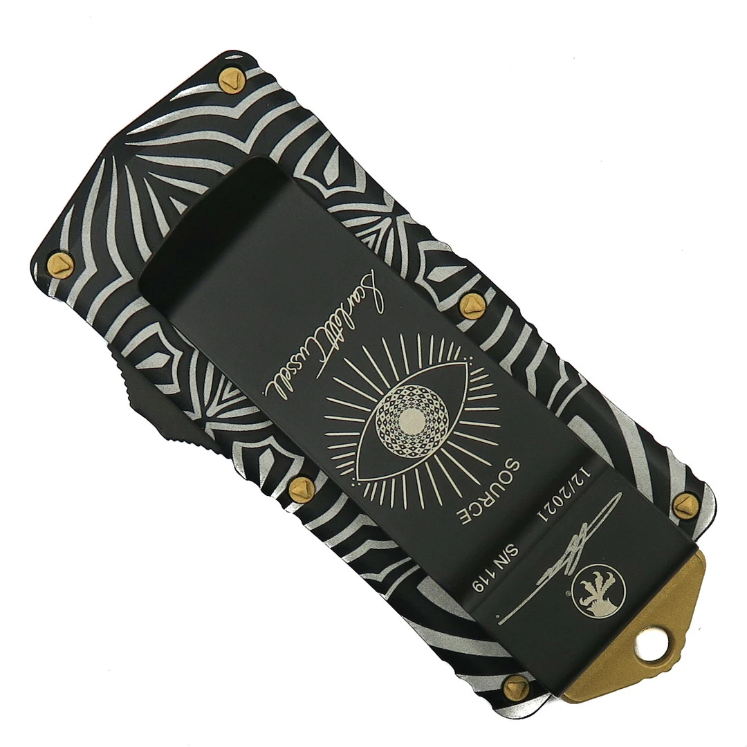 The blade is paired up with a black anodized aircraft aluminum handle features special “Source” artwork by Scarlett Cussell.