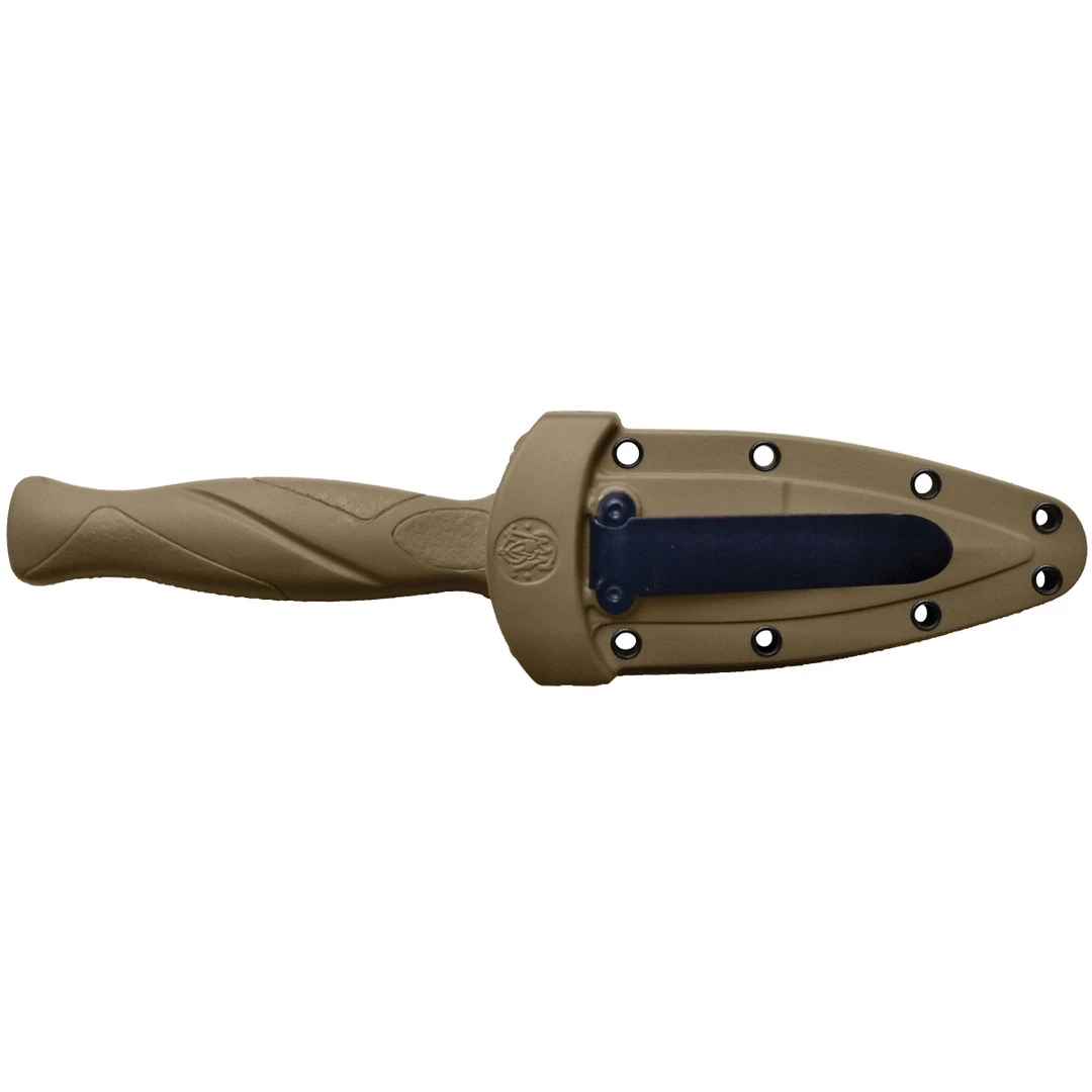The legacy of Smith & Wesson knives and tools is built on fine craftsmanship, quality and dependability. Their expansive line consists of assisted opening, folding and fixed blade knives, as well various multi-tools and accessories in an effort to offer something for every need and every job. The built-in finger guards keep your palm away from the edge while the flared handle on both side aids in a confident grip. This model features FDE-colored rubberized hard plastic handles, a single-edged spear point style blade in a black oxide finish and the FDE-colored hard plastic sheath includes a belt clip.