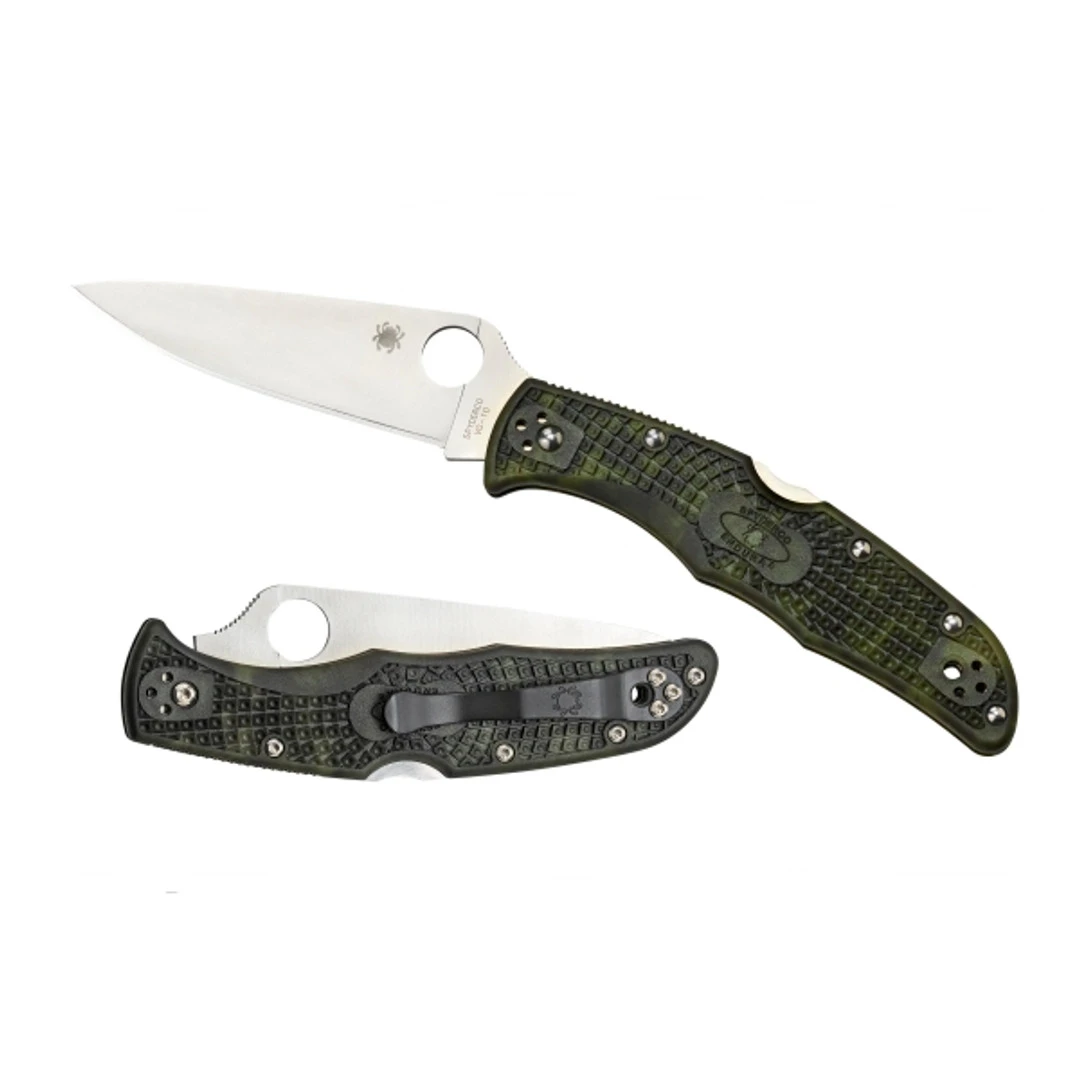 The Spyderco Endura series first debuted over 25 years and blazed the trail as one of the first lightweight clip-carry folder knives. Now in its 4th generation, the Spyderco Endura 4 folder knife has continually improved upon itself–offering a broad range of variations and finishes to meet virtually every users taste, style and needs. In 2016, Spyderco introduced the Zome (zoh-may) finish of models which is the ancient Japanese art of creating patterns using dyes from plants, flowers, fruits and other natural sources. Once the traditional injection molded FRN (fiberglass reinforced nylon) handle scales have been molded, expert Japanese artisans perform hiki-zome (brush dyeing) to hand brush unique, almost one-of-a-kind patterns. Much like anodization, the special dyes used completely permeate the FRN handle to permanently color it. This model, the C10ZFPGR, features a Zome green bidirectionally textured handle that comes standard with a high strength lock back mechanism, stainless steel liners, Spyderco’s trademark round hole opening feature and an ambidextrous 4-way positional pocket clip which allows for a tip up or tip down carry option on either side of the handle.