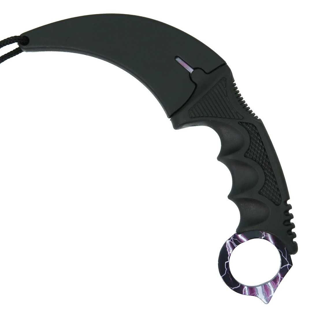 The Archimedes Claw Karambit is a beautiful, well constructed knife inspired by a tigers claw. This knife originated in Indonesia back in the 11th century. It was originally used for agricultural purposes such as gathering rice stalks, but eventually transitioned into a weapon used in many wars and as a self defense weapon. The shape of the blade allows for a more powerful and precise cutting stroke which was valuable for both of these different uses. This specific model showcases a purple electric finished blade and finger ring with a black textured handle. It comes in a hard plastic sheath with a lanyard for easy neck carry.